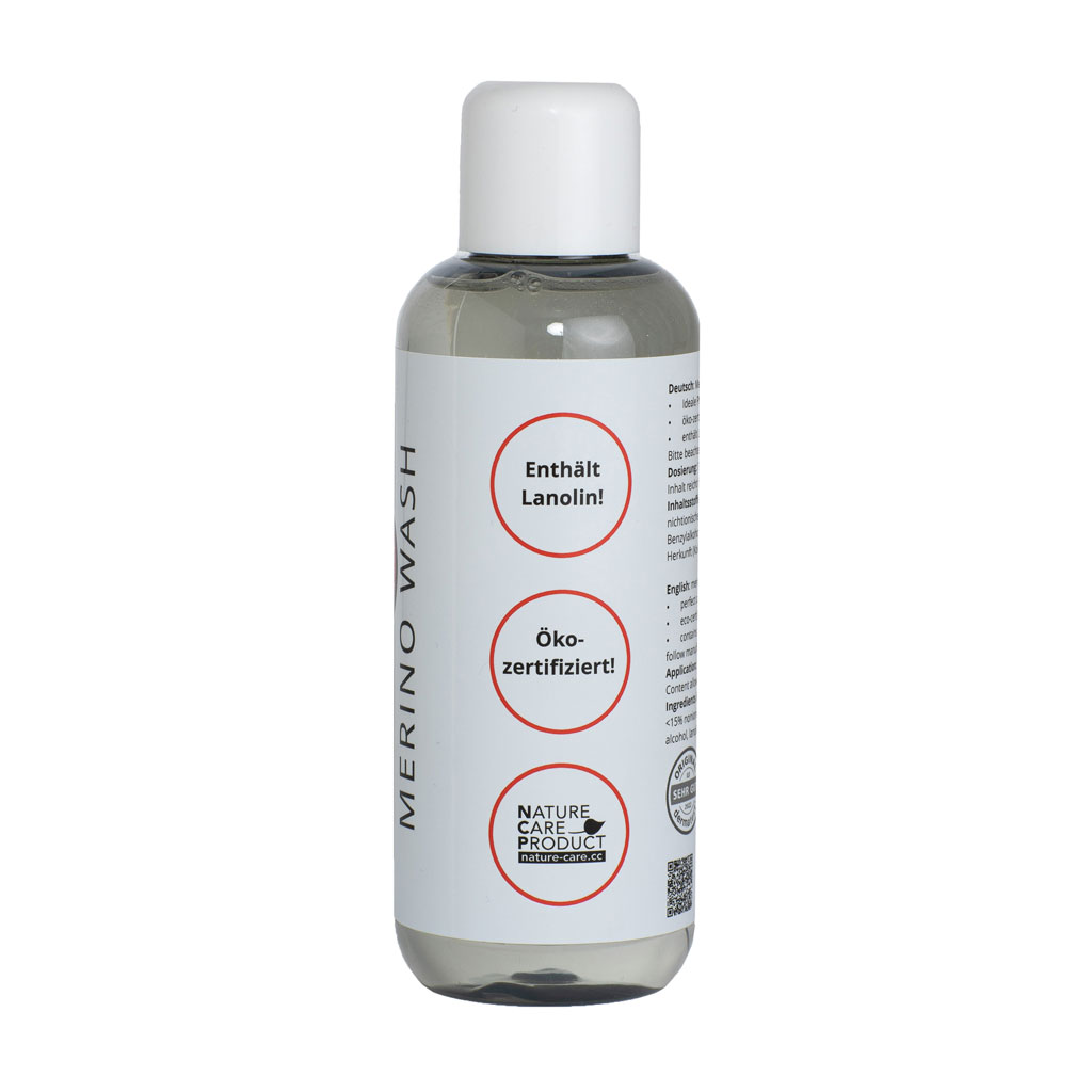 Die 250 ml Flasche Waschmittel reicht für 12 – 16 Waschgänge. Noch mehr zur Pflege von Merinowolle und Naturfasern findest du unter Produktpflege.